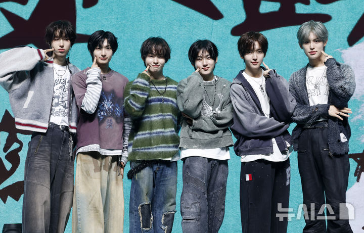 [서울=뉴시스] 김혜진 기자 = 그룹 킥플립(왼쪽부터 주왕, 동화, 케이주, 계훈, 동현, 민제)이 6일 오후 서울 광진구 예스24라이브홀에서 열린 네 번째 미니앨범 '마이 퍼스트 킥' 쇼케이스에서 포즈를 취하고 있다. 2026.04.06. [email protected]