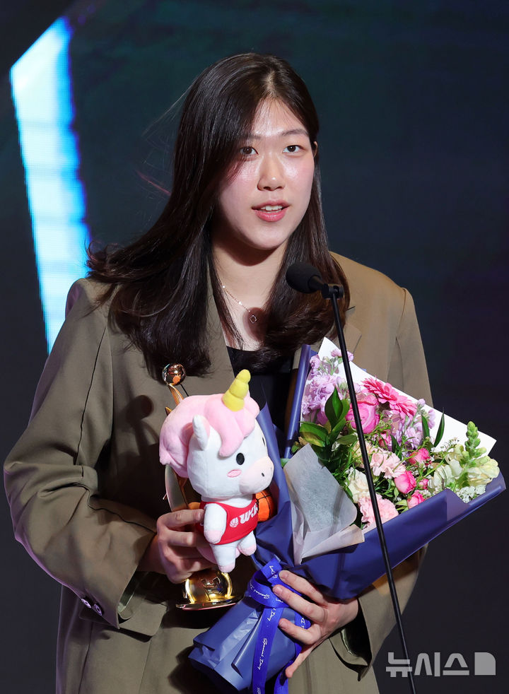 [서울=뉴시스] 홍효식 기자 = 6일 서울 용산구 서울드래곤시티에서 열린 2025-2026 여자프로농구 정규리그 시상식에서 몰텐 신인선수상을 수상한 BNK 썸 김도연이 소감을 밝히고 있다. 2026.04.06. [email protected]