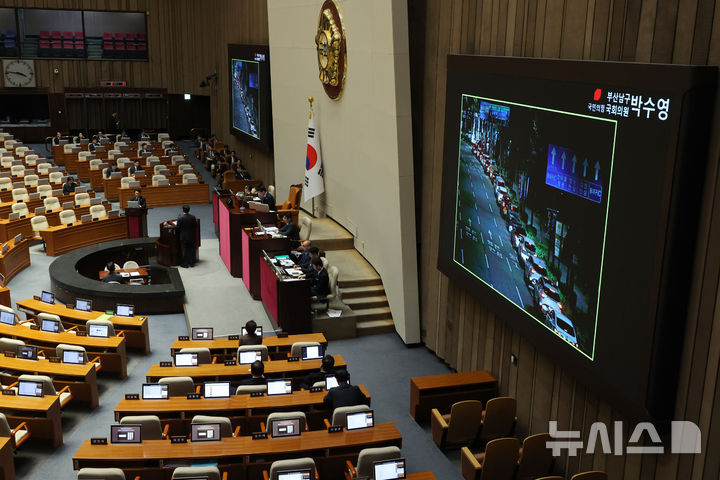 [서울=뉴시스] 김금보 기자 = 박수영 국민의힘 의원이 6일 오후 서울 여의도 국회에서 열린 제434회국회(임시회) 제2차 본회의에서 김민석 국무총리에게 주유소 차량행렬 사진을 보여주며 최고가격제에 대한 대정부질문을 하고 있다. 2026.04.06. [email protected]