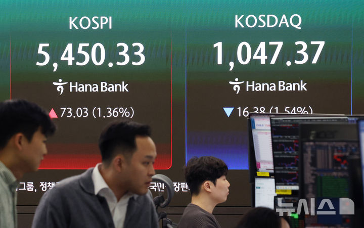 코스피는 전 거래일(5377.30)보다 73.03포인트(1.36%) 오른 5450.33에, 코스닥 지수는 전 거래일(1063.75)보다 16.38포인트(1.54%) 내린 1047.37에 거래를 마쳤다. 2026.04.06. [email protected]