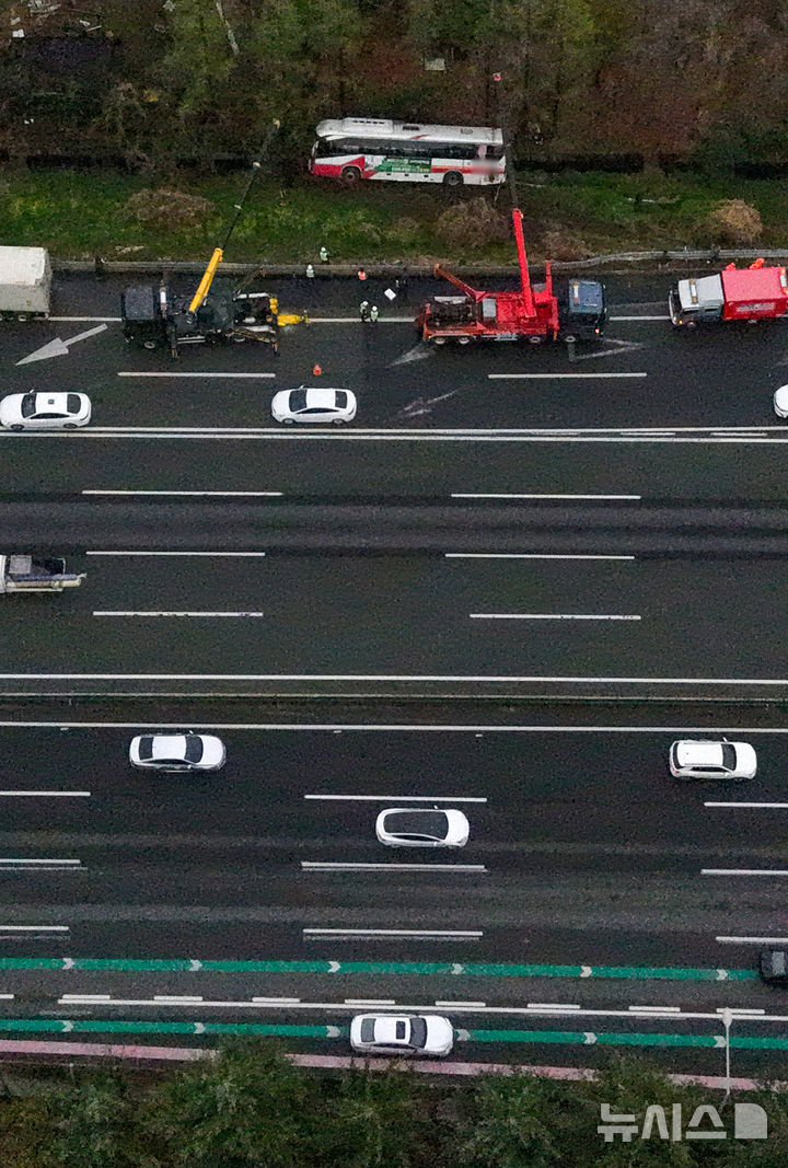 [대구=뉴시스] 이무열 기자 = 6일 오후 4시10분께 대구 북구 팔달동 경부고속도로 북대구IC 방향 금호분기점 인근을 달리던 시외버스가 가드레일을 들이받은 뒤 난간 아래로 떨어져 승객 등 8명이 다쳤다. 2026.04.06. [email protected]