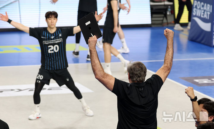 [천안=뉴시스] 이영환 기자 = 6일 오후 충남 천안시 서북구 유관순체육관에서 열린 2025-2026 V-리그 남자부 챔피언결정전 3차전 현대캐피탈과 대한항공의 경기, 세트스코어 3-0으로 승리한 현대캐피탈 필립 블랑 감독이 기뻐하고 있다. 2026.04.06. [email protected]