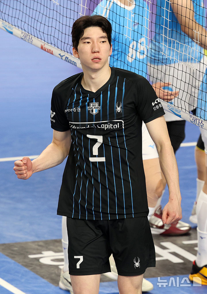 [천안=뉴시스] 이영환 기자 = 6일 오후 충남 천안시 서북구 유관순체육관에서 열린 2025-2026 V-리그 남자부 챔피언결정전 3차전 현대캐피탈과 대한항공의 경기, 현대캐피탈 허수봉이 득점 후 기뻐하고 있다. 2026.04.06. [email protected]