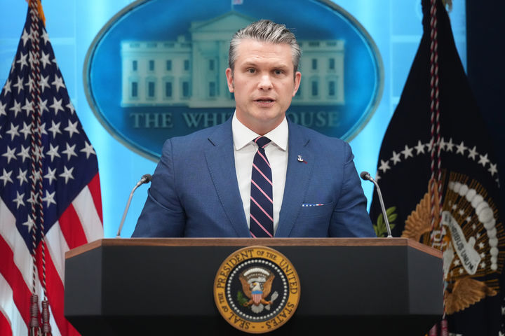 [워싱턴=AP/뉴시스] 피트 헤그세스 미국 국방장관이 6일(현지 시간) 워싱턴DC 백악관에서 도널드 트럼프 대통령과 함께 지난 3일 이란에서 격추된 F-15 전투기 탑승 장교 구출 작전 관련 기자회견을 하고 있다. 2026.04.07.