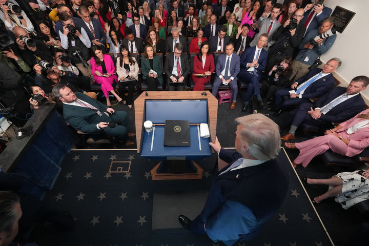 [워싱턴=AP/뉴시스] 도널드 트럼프 미국 대통령이 6일(현지 시간) 백악관 브리핑룸에서 이란 전쟁과 관련한 기자회견을 하고 있다. 2026.04.07.