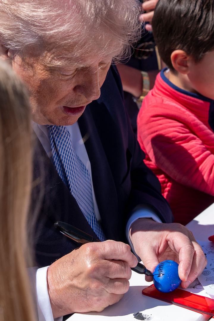 [워싱턴=AP/뉴시스] 도널드 트럼프 미국 대통령이 6일(현지 시간) 백악관 사우스론에서 열린 ‘백악관 부활절 달걀 굴리기’ 행사에 참석해 부활절 달걀에 서명하고 있다. 2026.04.07.