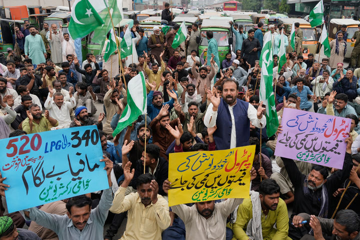[라호르=AP/뉴시스] 7일(현지 시간) 파키스탄 라호르에서 오토 릭샤 운전자들이 이란 전쟁 여파로 정부가 연료와 가스 가격을 인상하자, 이에 항의하는 시위를 벌이고 있다. 시위대가 든 팻말에는 “휘발유와 식료품 가격을 인하하라”라고 적혀 있다. 2026.04.07.