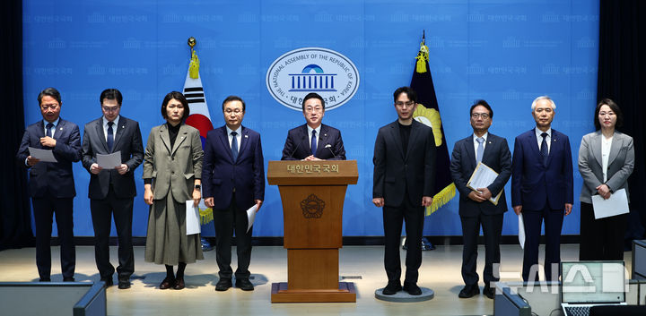 [서울=뉴시스] 김명년 기자 = 박성준 국회 윤석열 정권 정치검찰 조작기소 의혹 사건 진상규명 국정조사특별위원회 여당 간사가 7일 오전 서울 여의도 국회 소통관에서 기자회견을 열고 발언하고 있다. 2025.04.07. [email protected]