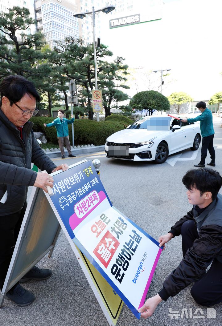 [부산=뉴시스] 하경민 기자 = 공공기관 차량 2부제 시행을 하루 앞둔 7일 부산 부산진구청 주차장 출입구에서 구청 관계자들이 안내문을 설치하고 있다.