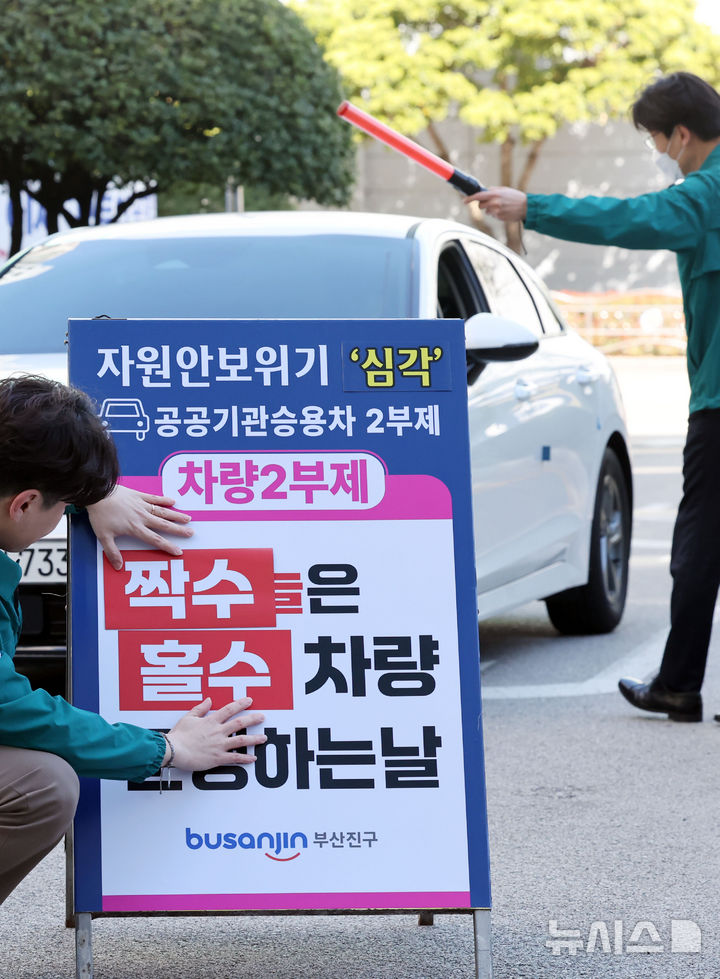 [부산=뉴시스] 하경민 기자 = 공공기관 차량 2부제 시행을 하루 앞둔 7일 부산 부산진구청 주차장 출입구에서 구청 관계자들이 안내문을 설치하고 있다.