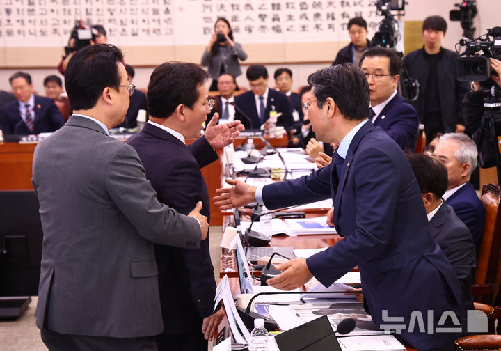 [서울=뉴시스] 김명년 기자 = 김형동 조작기소 특위 국민의힘 간사가 7일 서울 여의도 국회에서 열린 '윤석열 정권 정치검찰 조작기소 의혹사건 진상규명' 국정조사특별위원회 전체회의에서 박선원 더불어민주당 의원과 설전을 벌이고 있다. 2025.04.07. [email protected]