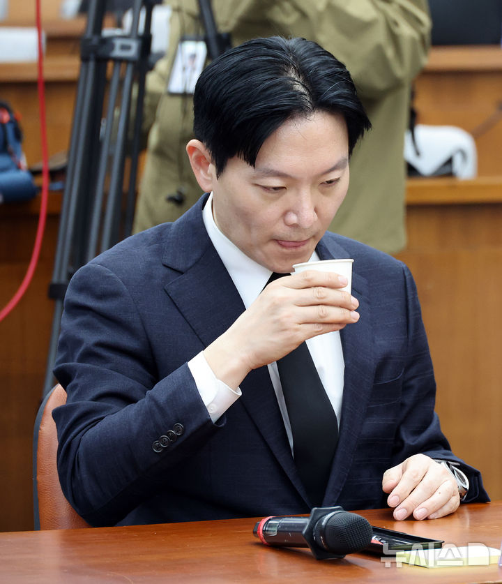 [서울=뉴시스] 김금보 기자 = 쌍방울 대북송금 사건 수사를 담당했던 박상용 인천지방검찰청 부부장검사가 7일 오전 서울 여의도 국회에서 열린 '이재명 죄지우기 국정조사 특위 국민의힘 위원단 주최 민주당의 공소취소 재판조작 진상규명 청문회'에서 물을 마시고 있다. 2026.04.07. [email protected]