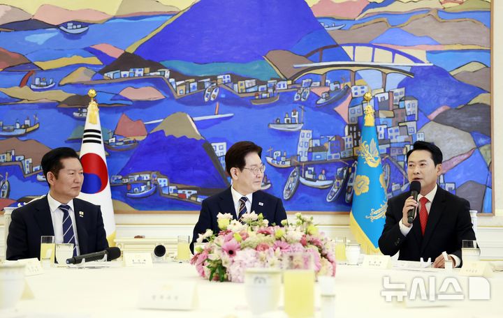 [서울=뉴시스] 최동준 기자 = 이재명 대통령이 7일 청와대에서 열린 여야정 민생경제협의체 회담 및 오찬에서 장동혁 국민의힘 대표의 발언을 듣고 있다. 왼쪽부터 정청래 더불어민주당 대표, 이 대통령, 장 대표. 2026.04.07. [email protected]