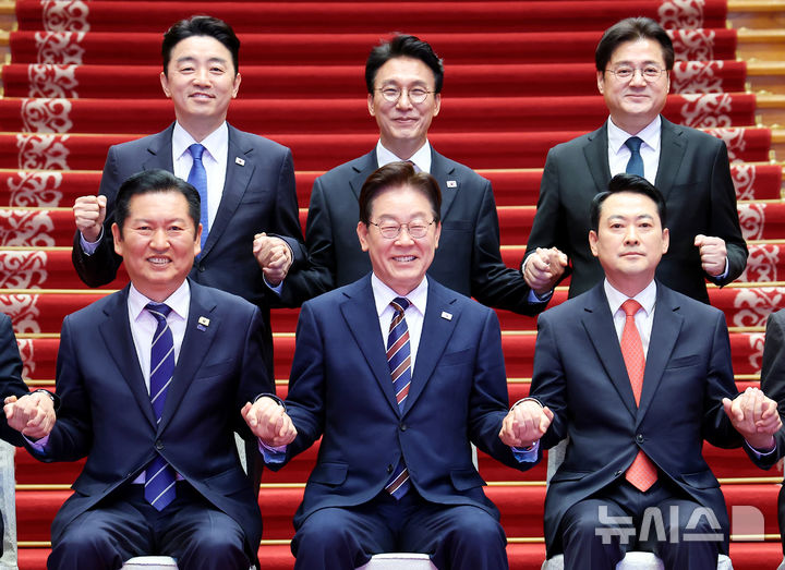 앞줄 왼쪽부터 정청래 더불어민주당 대표, 이 대통령, 장동혁 국민의힘 대표. 뒷줄 왼쪽부터 강훈식 비서실장, 김민석 국무총리, 홍익표 정무수석. 2026.04.07. [email protected]