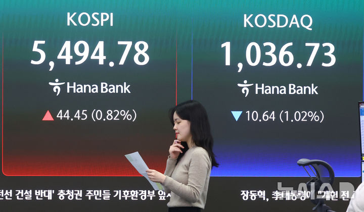 [서울=뉴시스] 황준선 기자 = 코스피가 전 거래일(5450.33)보다 44.45포인트(0.82%) 오른 5494.78에 마감한 7일 서울 중구 하나은행 딜링룸 전광판에 지수가 표시돼 있다. 코스닥 지수는 전 거래일(1047.37)보다 10.64포인트(1.02%) 하락한 1036.73에 거래를 마쳤다. 원·달러 환율은 전 거래일(1506.3원)보다 2.1원 내린 1504.2원에 주간 거래를 마감했다. 2026.04.07. [email protected]