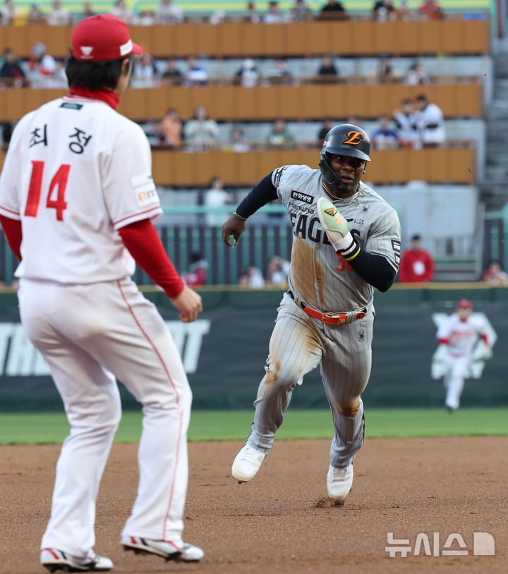 [인천=뉴시스] 최진석 기자 = 7일 인천 문학구장에서 열린 2026 KBO리그 한화 이글스와 SSG 랜더스의 경기, 1회초 1사 2루 상황 한화 2루주자 페라자가 문현빈의 안타 때  홈으로 향하고 있다. 2026.04.07. [email protected]