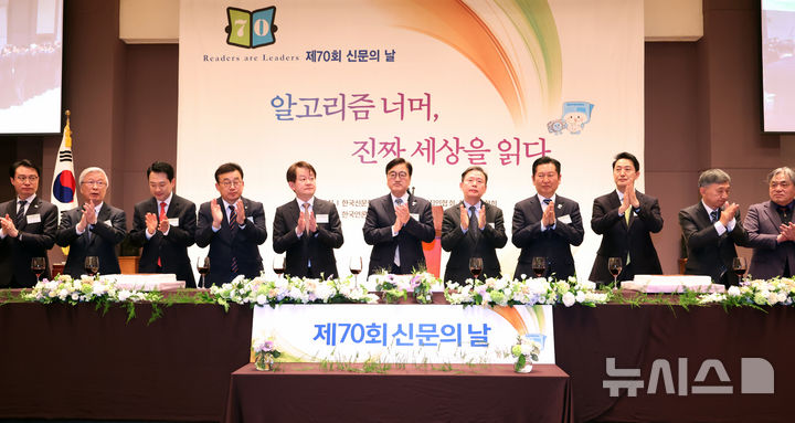 [서울=뉴시스] 조성우 기자 = 우원식(가운데) 국회의장과 정청래(오른쪽 네 번째) 더불어민주당 대표, 장동혁(왼쪽 세 번째) 국민의힘 대표, 오세훈(오른쪽 세 번째) 서울시장 등이 7일 오후 서울 중구 한국프레스센터에서 열린 제70회 신문의 날 기념 축하연에서 박수치고 있다. 2026.04.07. [email protected]