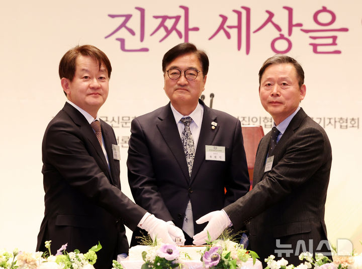 [서울=뉴시스] 조성우 기자 = 우원식(가운데) 국회의장이 7일 오후 서울 중구 한국프레스센터에서 열린 제70회 신문의 날 기념 축하연에서 떡케이크를 자르고 있다. 왼쪽부터 박장희 한국신문협회장, 우 의장, 이태규 한국신문방송편집인협회 회장. 2026.04.07. [email protected]