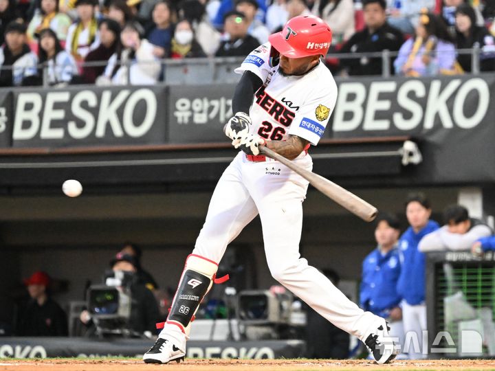[광주=뉴시스] 이현행 기자 = 7일 오후 광주 북구 광주-기아챔피언스필드에서 열린 2026 신한 SOL KBO리그 삼성 라이온즈 대 KIA타이거즈의 경기. 1회 말 1사 2, 3루 상황 KIA 카스트로가 역전 적시타를 때려내고 있다. 2026.04.07. [email protected]
