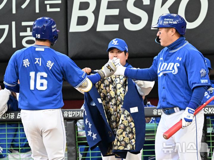 [광주=뉴시스] 이현행 기자 = 7일 오후 광주 북구 광주-기아챔피언스필드에서 열린 2026 신한 SOL KBO리그 삼성 라이온즈 대 KIA타이거즈의 경기. 1회 초 류지혁 선수가 우 담장을 넘기는 솔로 홈런을 날리고 최형우 선수의 축하를 받고 있다. 2026.04.07. [email protected]