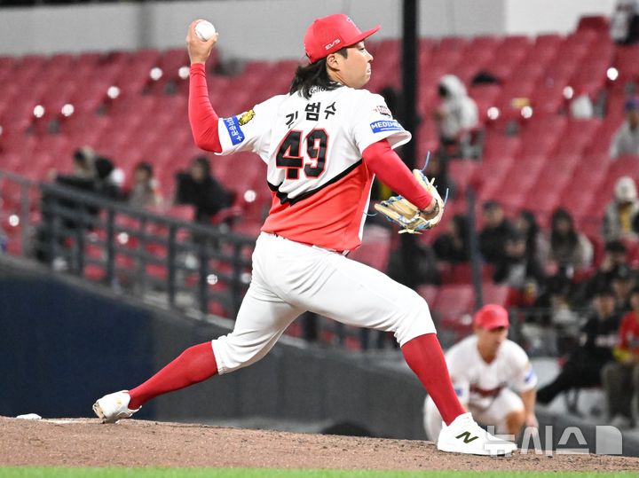[광주=뉴시스] 이현행 기자 = 7일 오후 광주 북구 광주-기아챔피언스필드에서 열린 2026 신한 SOL KBO리그 삼성 라이온즈 대 KIA타이거즈의 경기, 6회 초 KIA 김범수가 2아웃 주자 1, 2루 상황에서 마운드에 올라 역투하고 있다. 2026.04.07. [email protected]