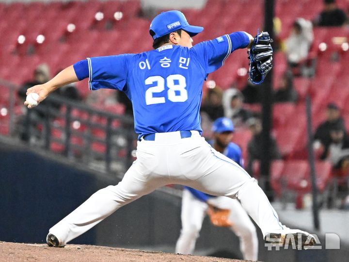 [광주=뉴시스] 이현행 기자 = 7일 오후 광주 북구 광주-기아챔피언스필드에서 열린 2026 신한 SOL KBO리그 삼성 라이온즈 대 KIA타이거즈의 경기, 6회 말 삼성 추격조 이승민이 역투하고 있다. 2026.04.07. [email protected]