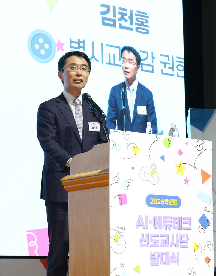 [서울=뉴시스] 조성우 기자 = 김천홍 서울시교육감 권한대행이 7일 오후 서울 서대문구 연세대학교 대강당에서 열린 2026학년도 AI·에듀테크 선도교사단 발대식에서 격려사하고 있다. (사진=서울시교육청 제공) 2026.04.07. [email protected] *재판매 및 DB 금지