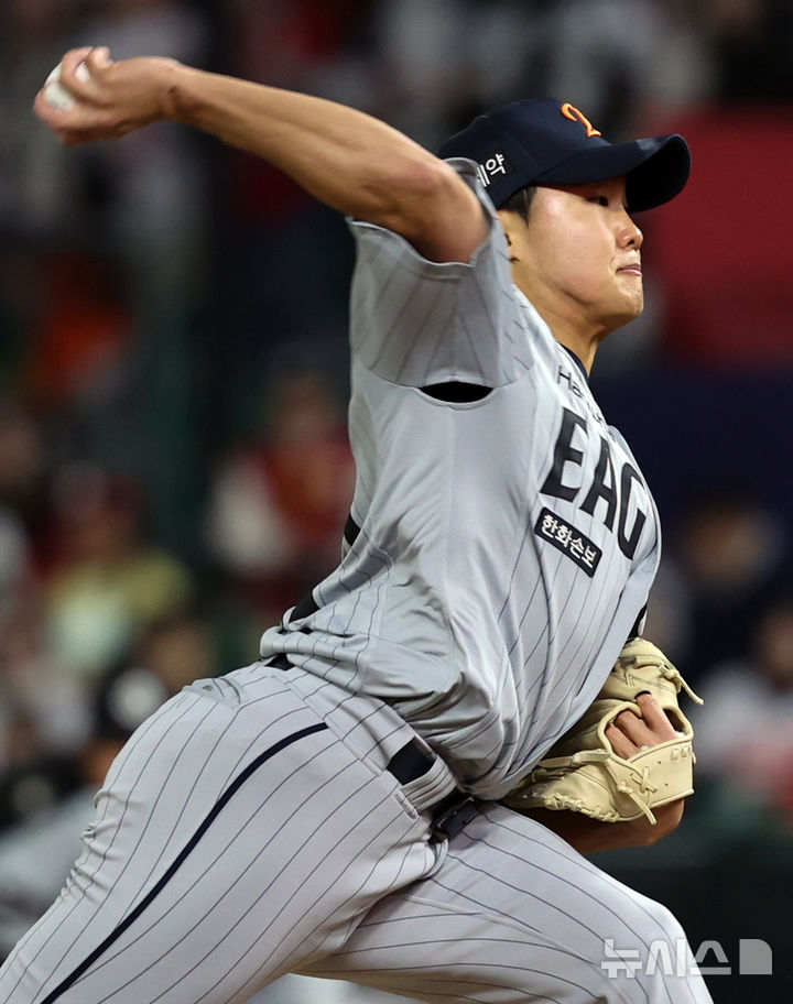 [인천=뉴시스] 최진석 기자 = 7일 인천 랜더스필드에서 열린 2026 KBO리그 한화 이글스와 SSG 랜더스의 경기, 8회말 한화 정우주가 역투하고 있다. 2026.04.07. [email protected]