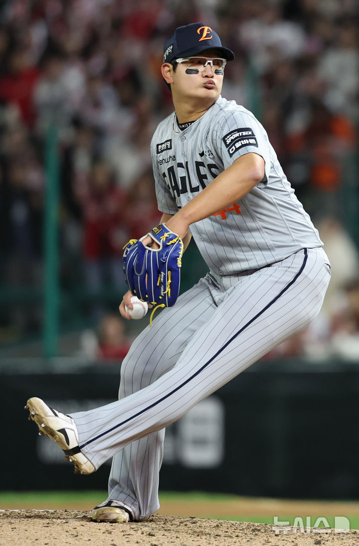 [인천=뉴시스] 최진석 기자 = 7일 인천 랜더스필드에서 열린 2026 KBO리그 한화 이글스와 SSG 랜더스의 경기, 9회말 한화 김서현이 역투하고 있다. 2026.04.07. [email protected]