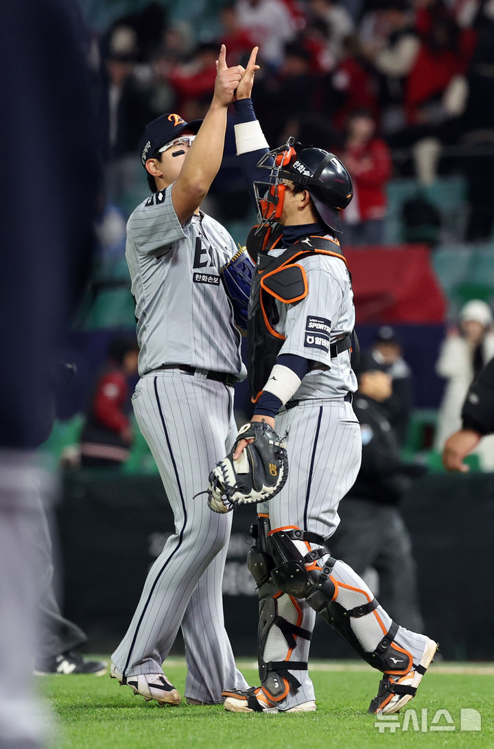 [인천=뉴시스] 최진석 기자 = 한화 김서현과 최재훈이 7일 인천 랜더스필드에서 열린 2026 KBO리그 한화 이글스와 SSG 랜더스의 경기에서 6대2로 승리 후 기뻐하고 있다. 2026.04.07. [email protected]