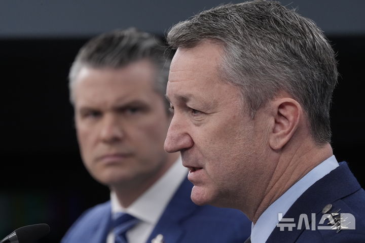 [워싱턴=AP/뉴시스] 정병혁 기자 = 댄 케인 미국 합참의장이 8일(현지 시간) 미국 워싱턴D.C. 펜타곤에서 열린 ‘장대한 분노(Epic Fury) 작전’ 관련 공동기자회견에서 발언하고 있다. 2026.04.08.