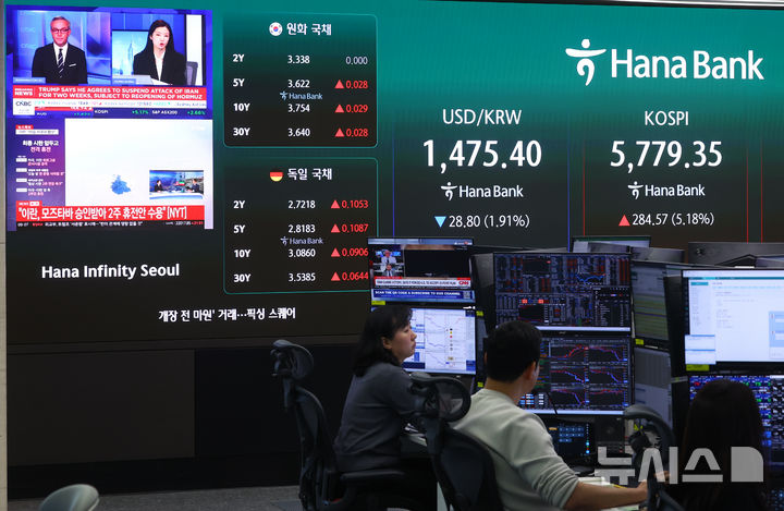 [서울=뉴시스] 황준선 기자 = 미국과 이란이 2주간 휴전에 사실상 합의한 8일 오전 서울 중구 하나은행 딜링룸에 코스피 지수와 원·달러 환율, 관련 보도가 송출되고 있다. 2026.04.08. [email protected]