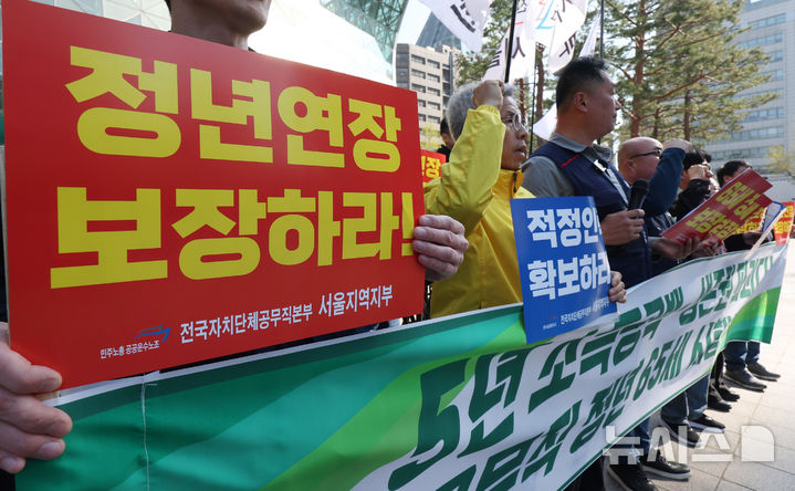 [서울=뉴시스] 조수정 기자 = 공공운수노조 전국자체단체공무직본부 서울지역지부 대표자들이 8일 오전 서울시청 앞에서 공무직 노동자 정년 65세 보장 촉구 기자회견을 하고 있다. 2026.04.08. [email protected]