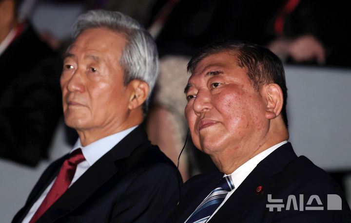 [서울=뉴시스] 홍효식 기자 = 이시바 시게루(오른쪽) 전 일본 총리와 정몽준 아산정책연구원 명예이사장이 8일 서울 중구 그랜드 하얏트 서울에서 열린 아산정책연구원 연례 포럼 '아산 플래넘 2026' 개회식에서 영상을 시청하고 있다. 2026.04.08. [email protected]