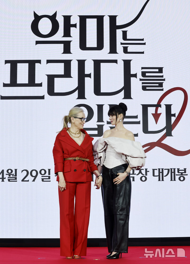 [서울=뉴시스] 김혜진 기자 = 배우 앤 헤서웨이(왼쪽), 메릴 스트립이 8일 서울 종로구 포시즌스 호텔에서 열린 영화 '악마는 프라다를 입는다2' 내한 기자간담회에서 포즈를 취하고 있다. 2026.04.08. [email protected]