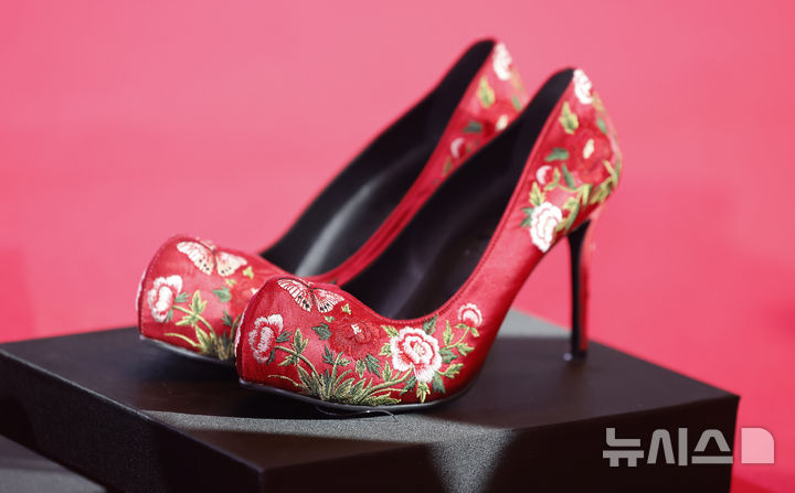 [서울=뉴시스] 김혜진 기자 = 8일 서울 종로구 포시즌스 호텔에서 열린 영화 '악마는 프라다를 입는다2' 내한 기자간담회가 열렸다. 사진은 한국 관계자가 앤 헤서웨이에게 선물한 한국 꽃신을 연상화한 하이힐. 2026.04.08. [email protected]