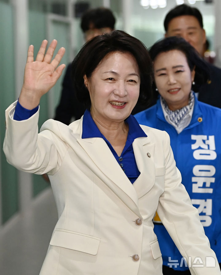 [수원=뉴시스] 김종택기자 = 추미애 더불어민주당 경기도지사 후보가 8일 경기 수원시 경기도의회에서 기자회견을 하기 위해 브리핑룸으로 들어서며 손을 흔들고 있다. 2026.04.08. [email protected]