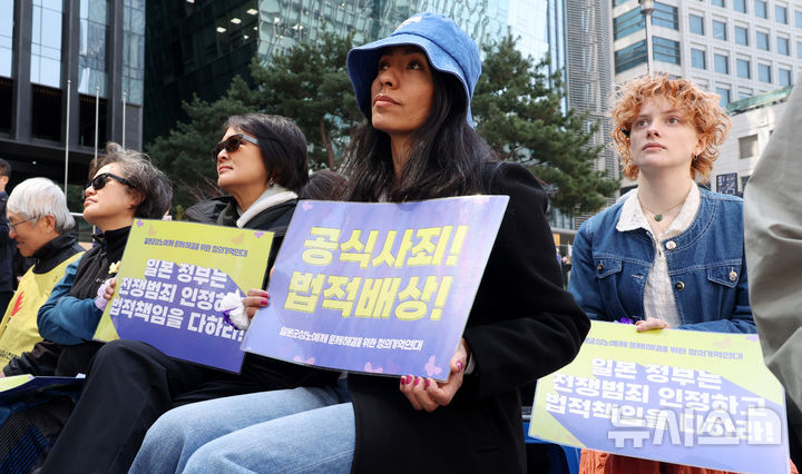 [서울=뉴시스] 추상철 기자 = 8일 서울 종로구 옛 주한 일본대사관 앞에서 열린 제1747차 일본군 성노예제 문제해결을 위한 정기 수요시위에서 외국인 참가자가 일본의 공식 사죄 등을 촉구하는 피켓을 들고 있다. 2026.04.08. [email protected]