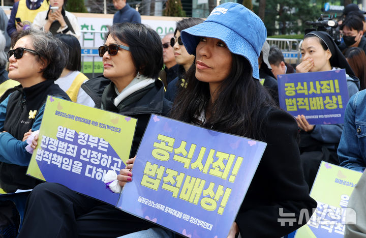 [서울=뉴시스] 추상철 기자 = 8일 서울 종로구 옛 주한 일본대사관 앞에서 열린 제1747차 일본군 성노예제 문제해결을 위한 정기 수요시위에서 외국인 참가자가 일본의 공식 사죄 등을 촉구하는 피켓을 들고 있다. 2026.04.08. [email protected]