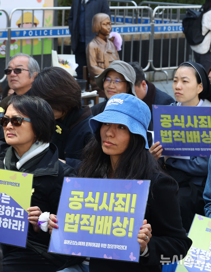 [서울=뉴시스] 추상철 기자 = 8일 서울 종로구 옛 주한 일본대사관 앞에서 열린 제1747차 일본군 성노예제 문제해결을 위한 정기 수요시위에서 외국인 참가자가 일본의 공식 사죄 등을 촉구하는 피켓을 들고 있다. 2026.04.08. [email protected]