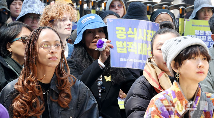 [서울=뉴시스] 추상철 기자 = 8일 서울 종로구 옛 주한 일본대사관 앞에서 열린 제1747차 일본군 성노예제 문제해결을 위한 정기 수요시위에서 외국인 참가자가 일본의 공식 사죄 등을 촉구하는 피켓을 들고 있다. 2026.04.08. [email protected]