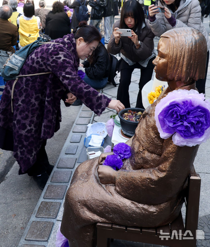 [서울=뉴시스] 추상철 기자 = 8일 서울 종로구 옛 주한 일본대사관 앞에서 열린 제1747차 일본군 성노예제 문제해결을 위한 정기 수요시위에서 참가자가 평화의 소녀상에 평화를 염원하는 떡을 놓고 있다. 2026.04.08. [email protected]