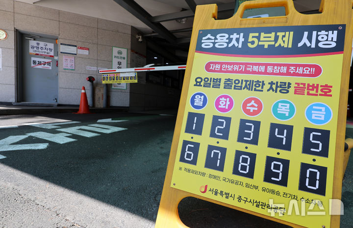 5부제는 자동차번호판 끝번호가 1·6번이면 월요일, 2·7번은 화요일, 3·8번은 수요일, 4·9번은 목요일, 5·0번은 금요일 운휴에 들어가는 방식이다. 주말과 공휴일은 운행이 가능하다. 제외되는 공영주차장은 전통시장·관광지 인근 등 국민경제에 영향을 미치는 주차장, 환승주차장 등 대중교통 이용에 영향을 미치는 주차장, 주차혼잡지역으로 현저한 주차난이 발생할 우려가 있다고 공공기관장이 인정하는 주차장 등이다. 2026.04.08. [email protected]