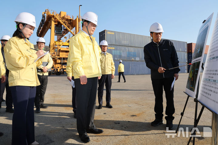 [의왕=뉴시스] 고범준 기자 = 이재명 대통령이 8일 경기 의왕 내륙컨테이너 기지를 방문해 고유가 위기극복을 위한 화물운송·물류업계 현장 간담회를 마친 뒤 운영 현황 보고를 받고 있다. 2026.04.08. [email protected]