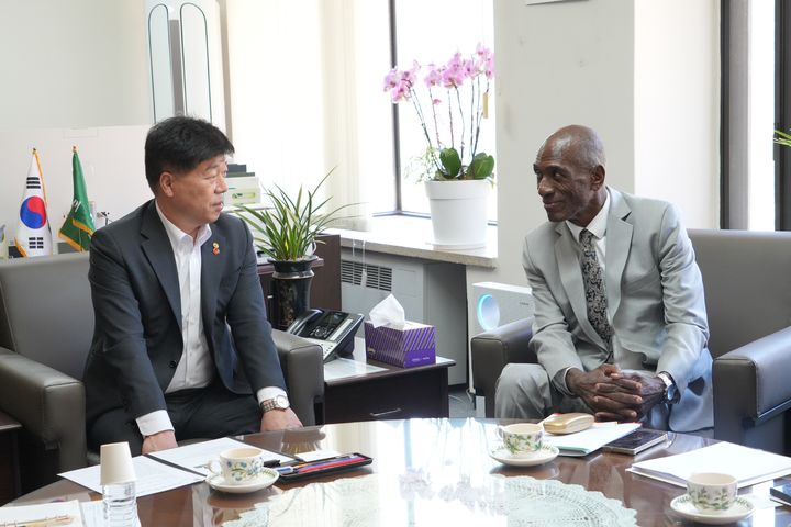 [서울=뉴시스] 정병혁 기자 = 최형재 새마을운동중앙회 사무총장이 8일 경기 성남시 새마을운동중앙회에서 앤드류 브웨자니 반다 주한 잠비아 대사와 지구촌새마을운동 추진을 위한 국가 간 협력 방안을 논의하고 있다. (사진=새마을운동중앙회 제공) 2026.04.08. [email protected] *재판매 및 DB 금지