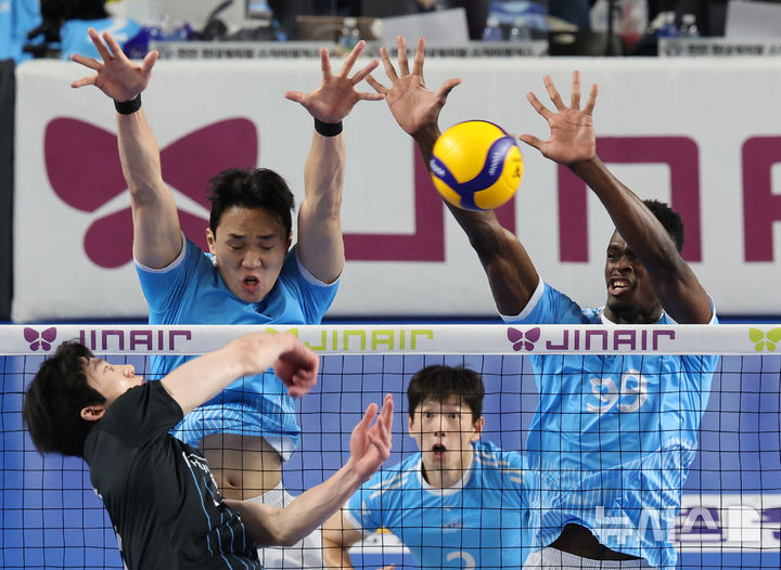 [천안=뉴시스] 박주성 기자 = 8일 오후 충남 천안시 서북구 유관순체육관에서 열린 2025-2026 V-리그 남자부 챔피언결정전 4차전 현대캐피탈과 대한항공의 경기에서 헌대캐피탈 허수봉의 공격을 대한항공 선수들이 막고 있다. 2026.04.08. [email protected]