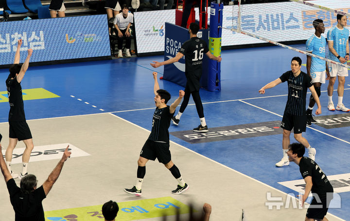 [천안=뉴시스] 박주성 기자 = 8일 오후 충남 천안시 서북구 유관순체육관에서 열린 2025-2026 V-리그 남자부 챔피언결정전 4차전 현대캐피탈과 대한항공의 경기에서 현대캐피탈이 세트 스코어 3대0으로 승리 후 환호하고 있다. 2026.04.08. [email protected]