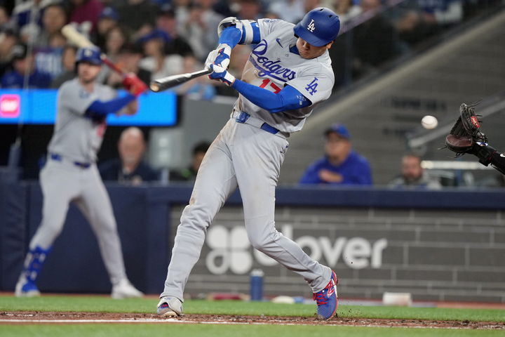 [토론토=AP/뉴시스] LA 다저스의 오타니 쇼헤이가 8일(현지 시간) 캐나다 토론토의 로저스 센터에서 열린 2026 MLB 토론토 블루제이스와 경기 3회 초 삼진당하고 있다. 오타니는 3타수 무안타 1볼넷 2삼진을 기록했고, 투수로는 6이닝 4피안타 1실점(비자책) 1볼넷 2삼진으로 호투했으나, 다저스는 3-4로 역전패했다. 2026.04.09.