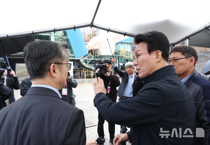 [세종=뉴시스] 강종민 기자 = 김민석 국무총리가 9일 세종시 장군면 아스팔트콘크리트 생산현장을 찾아 애로사항을 듣고 있다. 2026.04.09. [email protected]