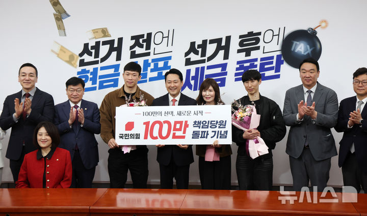 [서울=뉴시스] 김명년 기자 = 장동혁 국민의힘 대표가 9일 오전 서울 여의도 국회에서 열린 100만 책임당원 돌파 기념식에서 기념촬영하고 있다. 2025.04.09. [email protected]